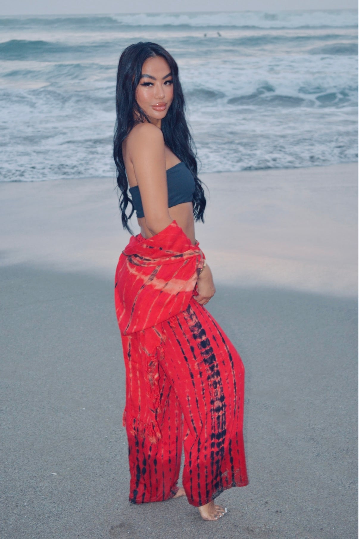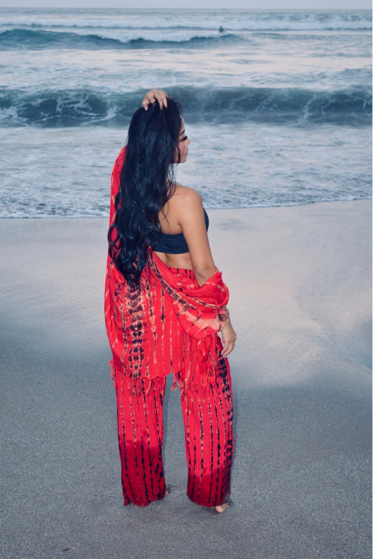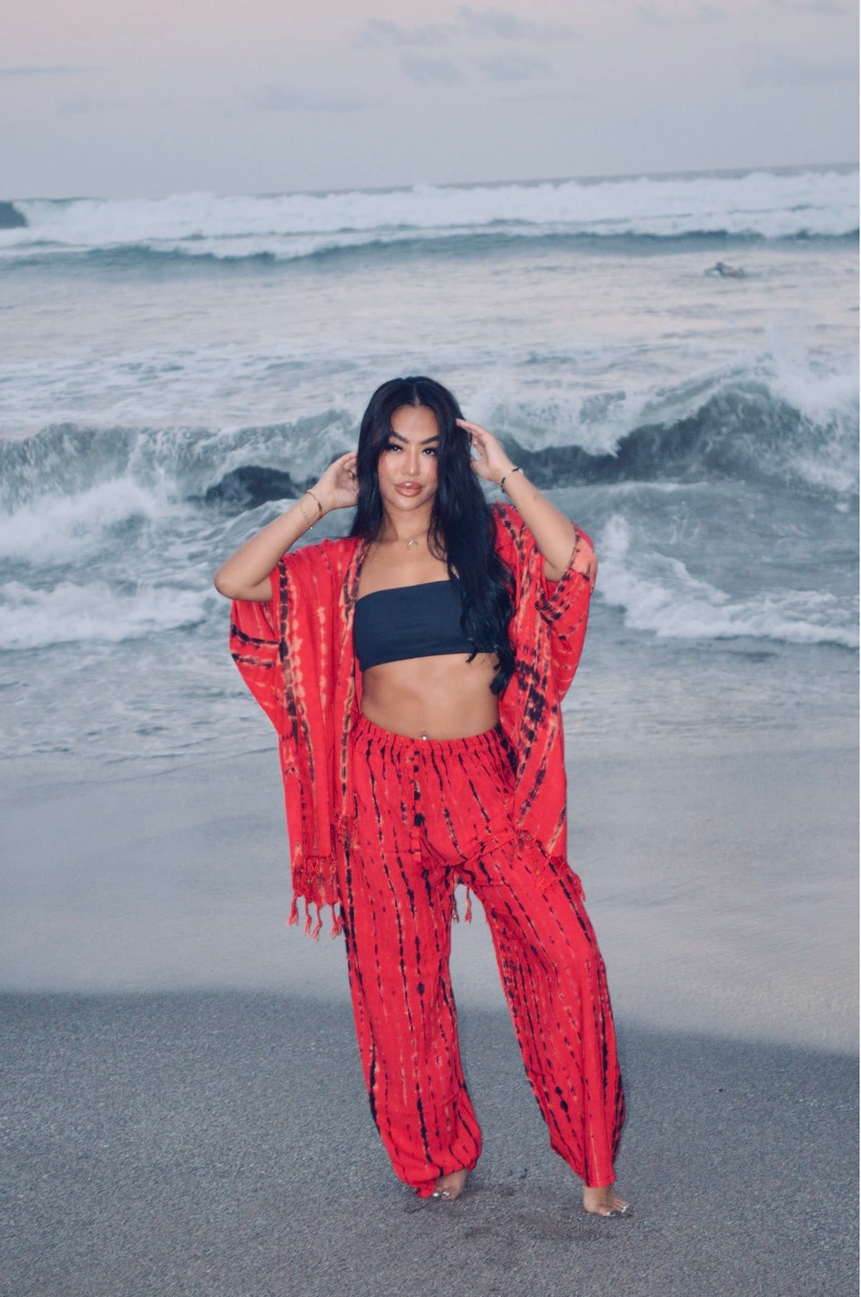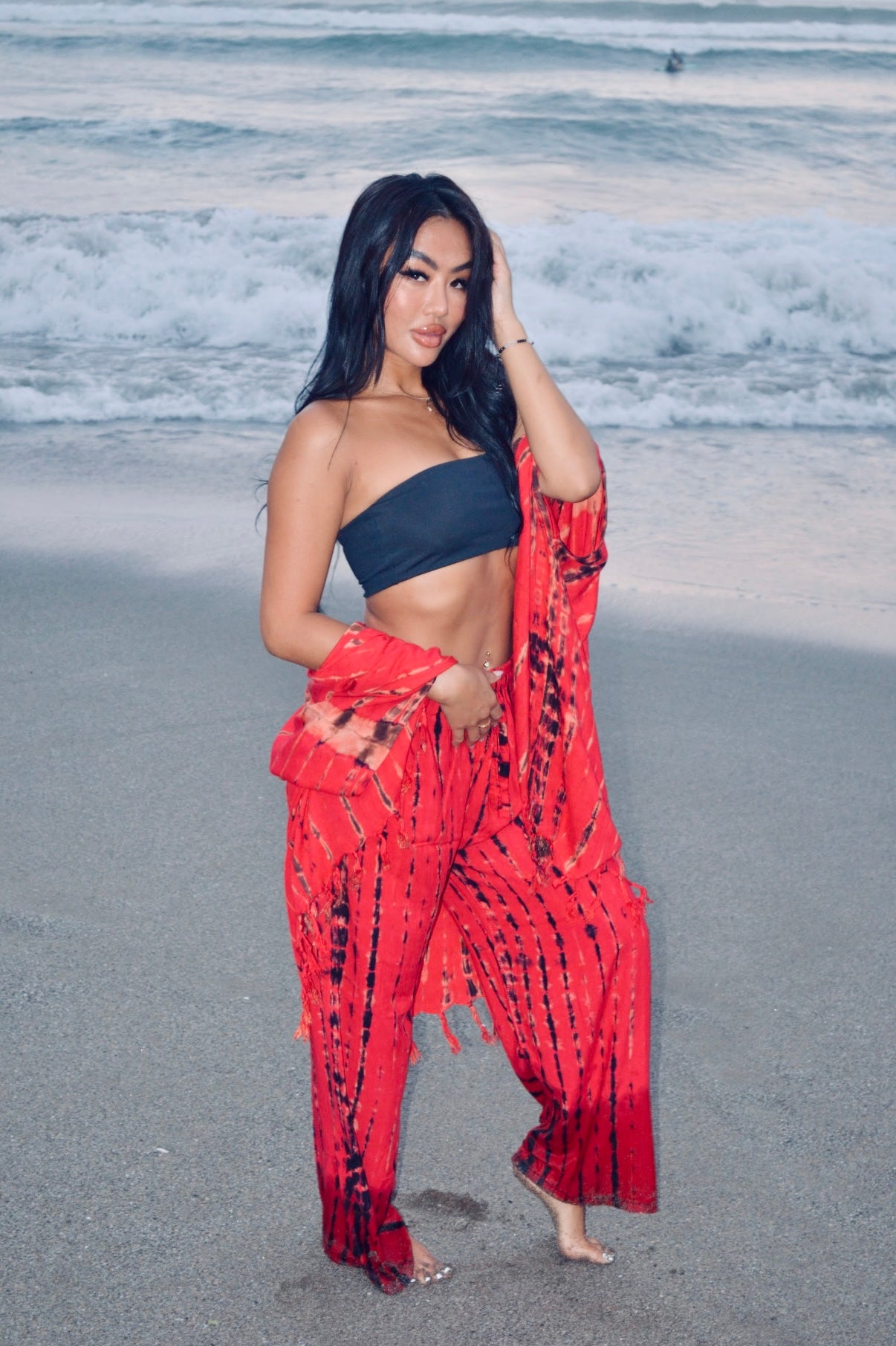 Represent the striking Comet of the nightsky in this 2-piece set! You’ll be sure to stand out ☄️ Featuring a reddish-orange color with black dye and accents of beige within the print and an oversized fit.