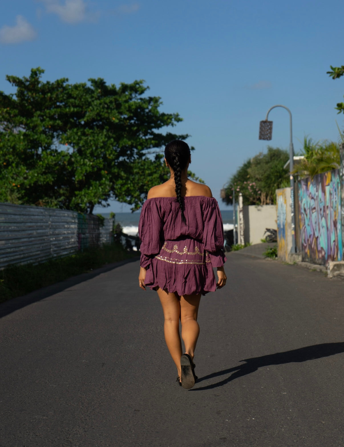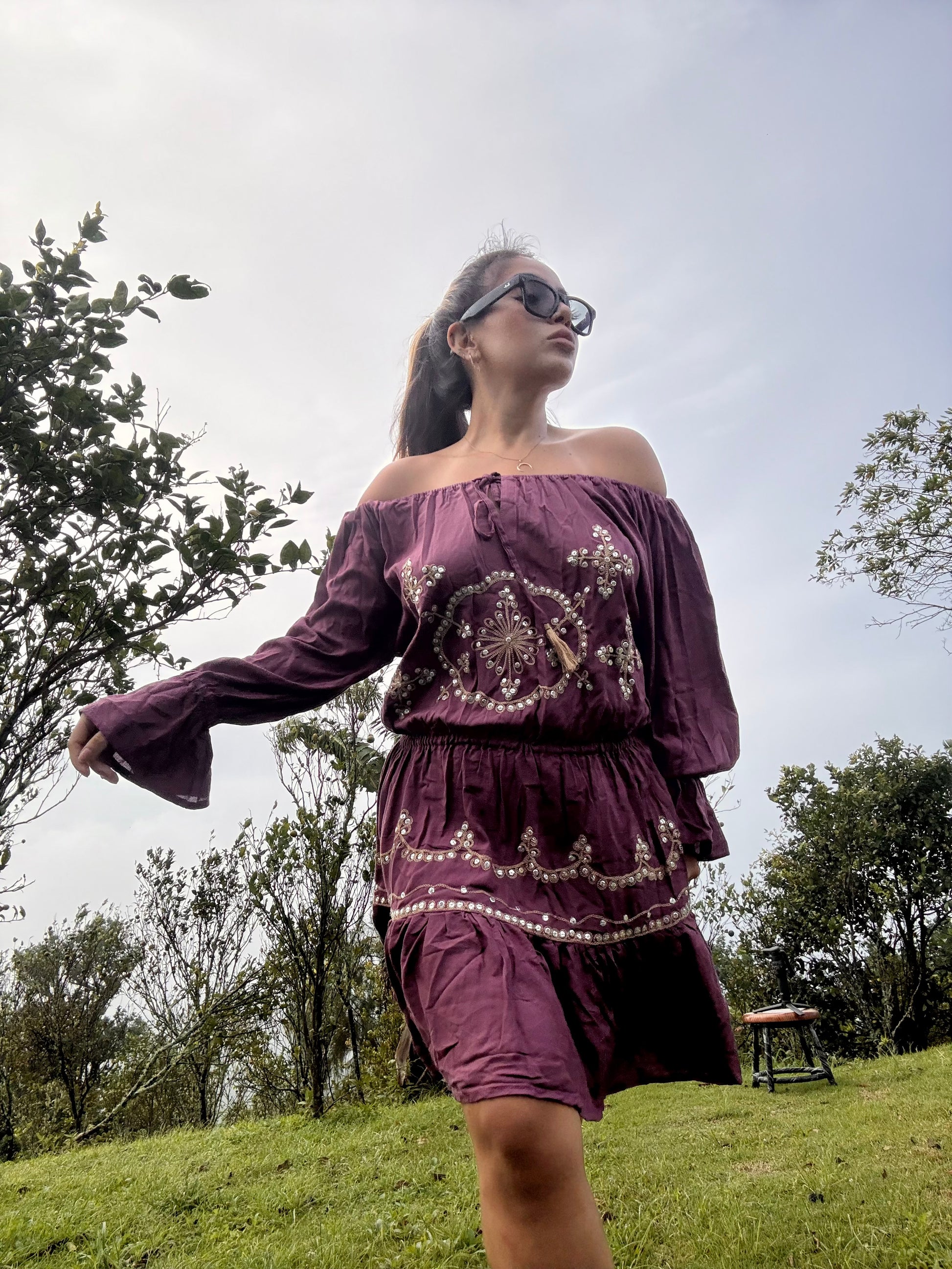 Feel the GODDESS you are in this captivating long sleeve comfortable, purple romper with an open skirt that falls right at the knees. Hand embroidery with silver sequin can be seen from day to night. Stunning!