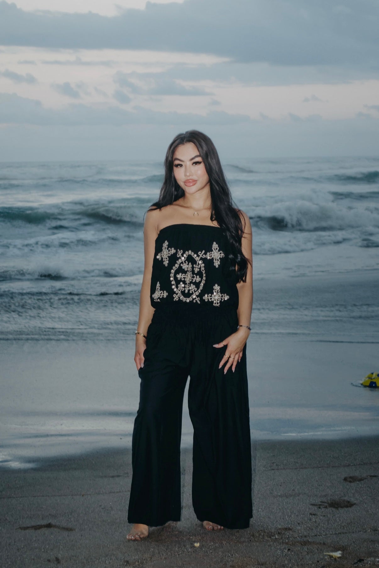 Represent the Magic of Bali with this captivating top! This sleeveless, loose-fitting top is flattering on everyone! Features a solid color with mirror reflecting eyelet detail (all hand-stitched)! Pair this with the Relax Pant.